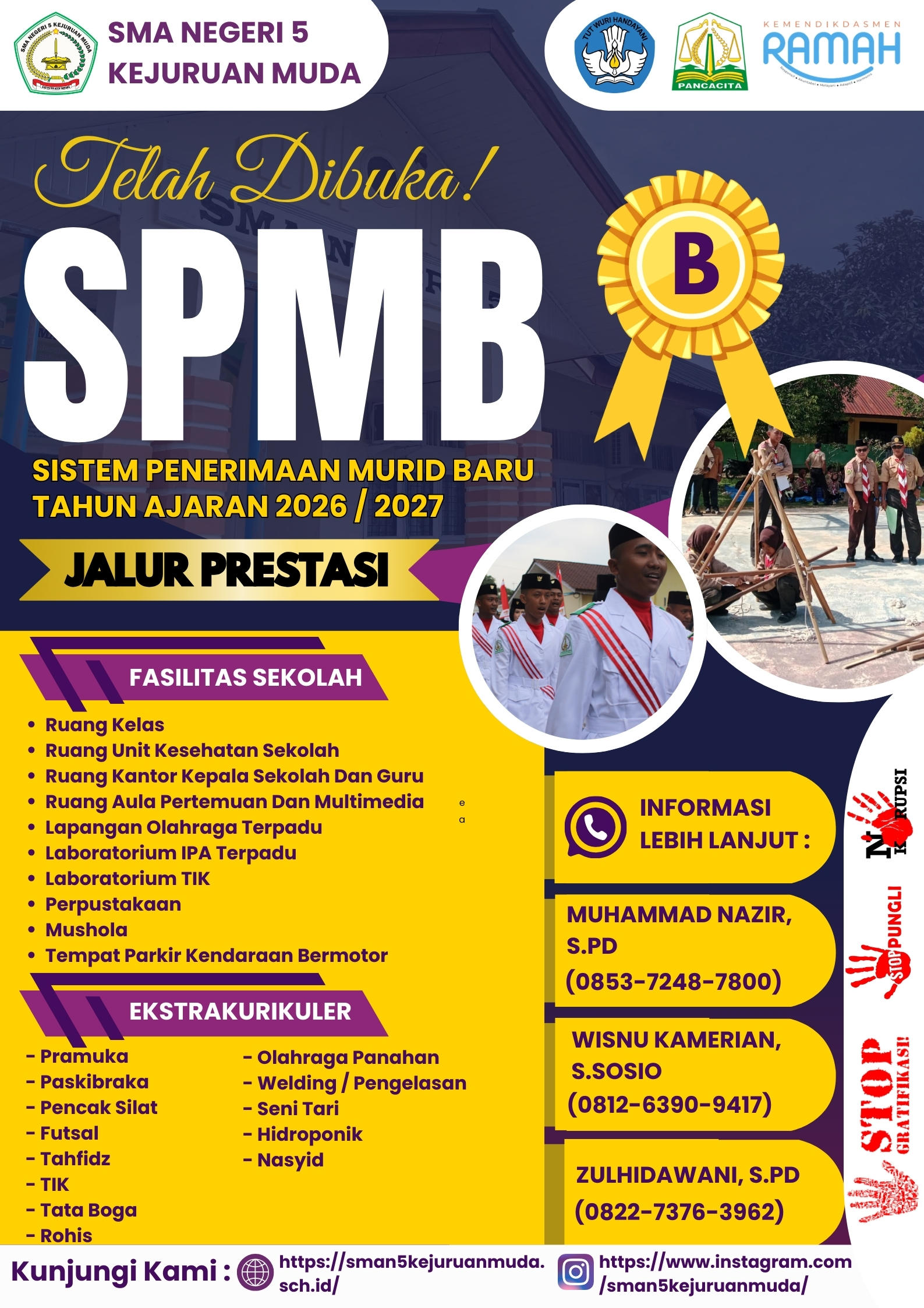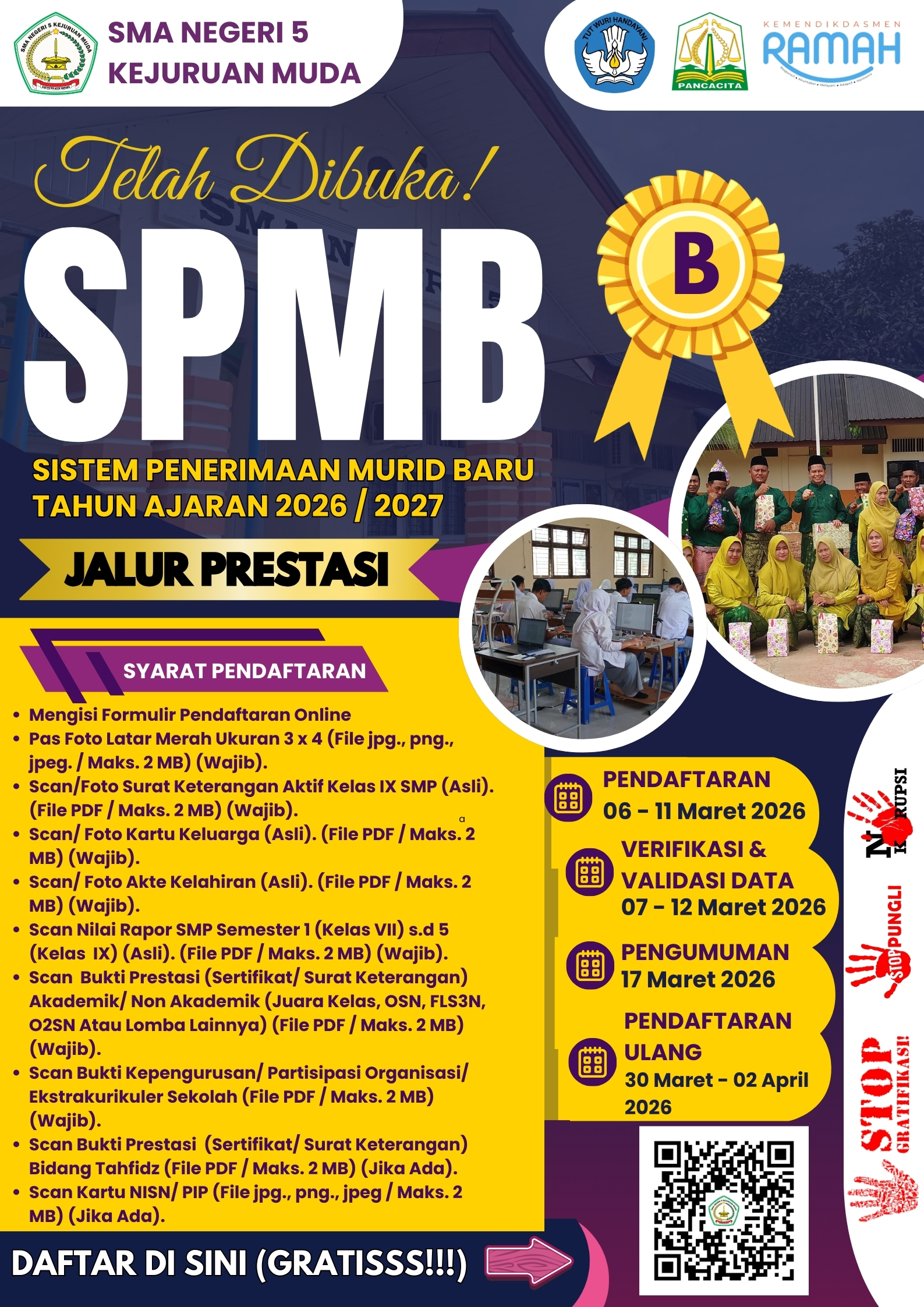 2026/2027 Jenjang SMA dan SMK Jalur Prestasi, maka dengan ini SMA Negeri 5 Kejuruan Muda kembali membuka Pendaftaran SPMB-Jalur Prestasi Jenjang SMA untuk seluruh Calon Siswa/I baru yang akan belajar atau menimba ilmu pengetahuan di SMA Negeri 5 Kejuruan Muda.